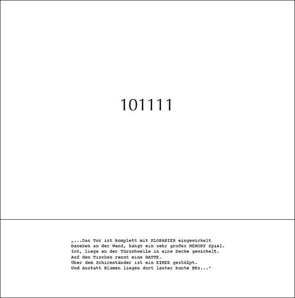 The text of the sound work is a tool of the memory athlete, a translation of binary numbers in images. While you are listening to the radio play the projection shows the current sequence of binary numbers, which belong to the particular metaphor. |