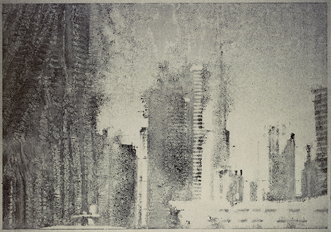 elsewhere I,II,III Motifs from 3D visualizations of architectural designs are illuminated on paper by the silver-free photographic blueprint prozess called Diazotype. Diazotype was primarily used for the reproduction of technical drawings.Therefore, architects also used it to reproduce their plans. By and by diazotypes fade, the picture will disappear.
